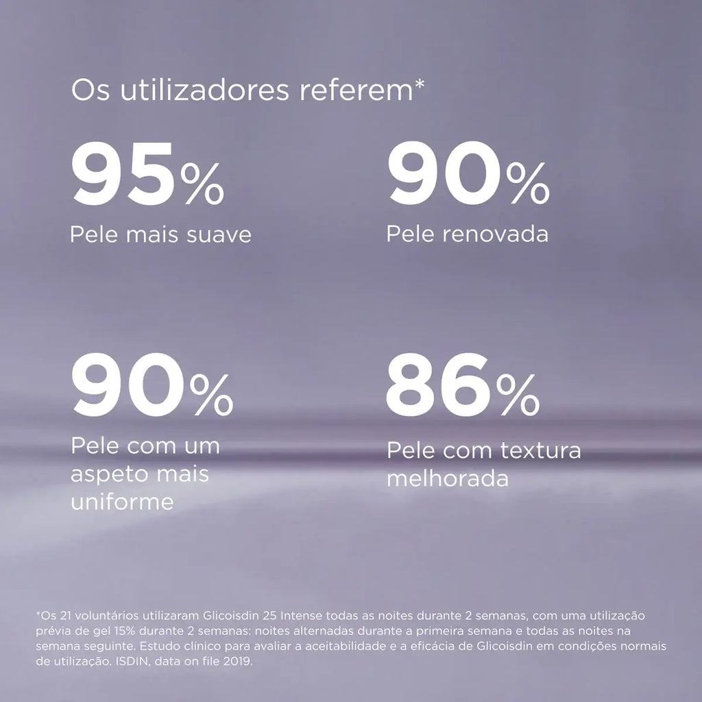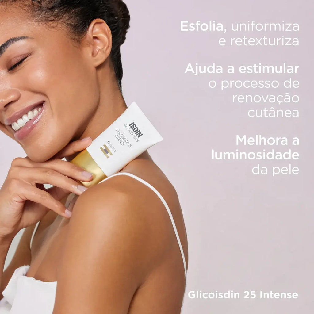 Minimiza a aparência das rugas, linhas de expressão finas e irregularidades com Glicoisdin® 25 Intense. Ajuda a estimular o processo de renovação da pele, retexturiza e melhora a sua firmeza.