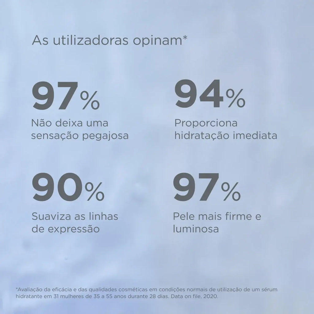 Sérum facial com ácido hialurónico puro, de baixo e médio peso molecular, e textura aqua-gel que proporciona uma hidratação quer superficial quer profunda. Ajuda a redensificar a pele e prevenir as primeiras rugas e linhas de expressão, diminui visivelmente os poros e proporciona luminosidade, para uma pele radiante.