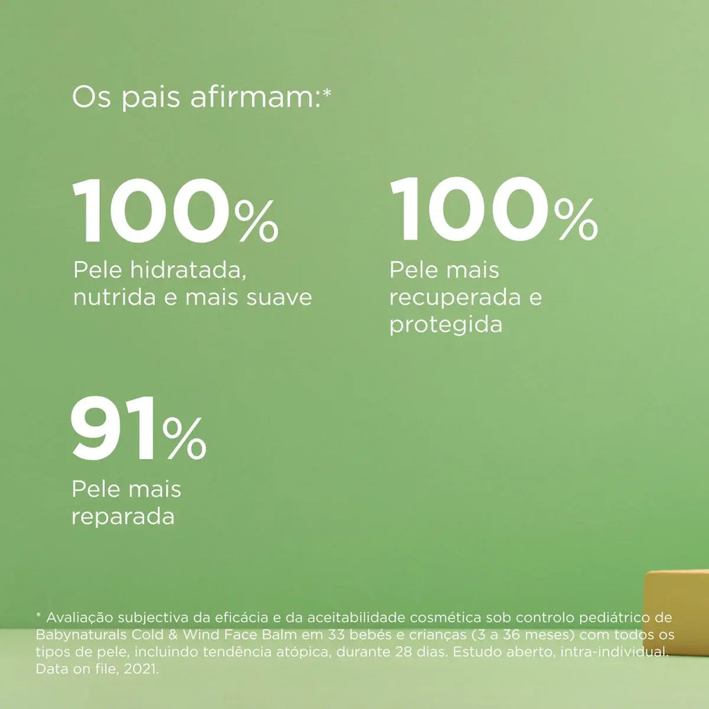 A fórmula de Babynaturals Bálsamo Facial Cold & Wind contém 96% de ingredientes de origem natural e é biodegradável em 93%. Proteja o seu bebé, proteja o nosso planeta.